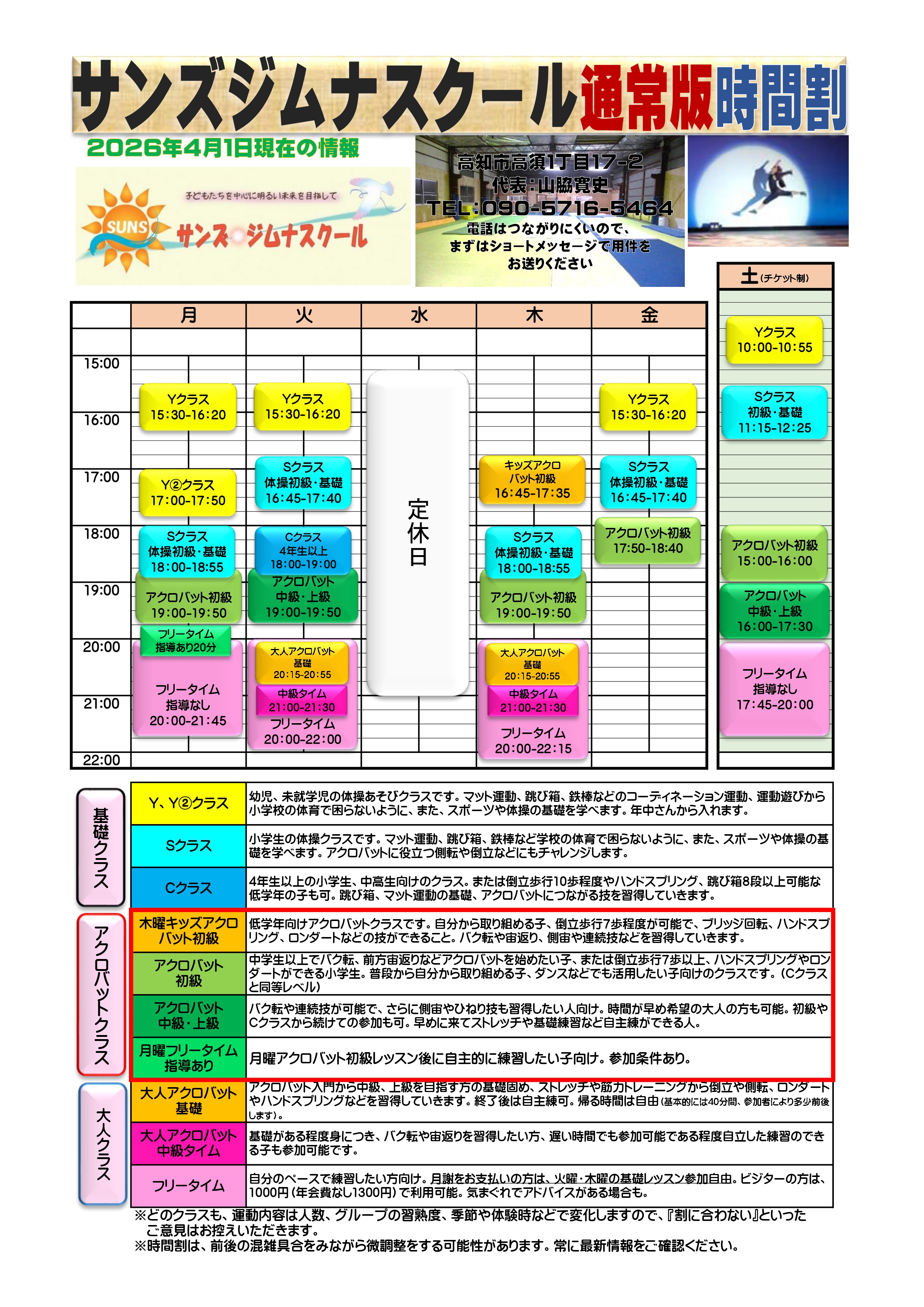 ↓入会・体験についてはこちらをチェックしてください↓ ![]() 男女問わず、運動苦手な子、体操好きな子、 ダンスや習い事の運動機能やスキルアップなどに 体操は近年注目されています。 ↑入会および体験レッスンの受付は期間を設けていますのでご確認ください↑ ~現レギュラー生~ レッスン中、運動時、待合室では、 マスク着用を自由化しています ただし、咳や風邪気味の症状がある場合は、 マスク着用または無理されないようにしてください。 レッスン前に 健康状態をチェックしてください。 こちらのホームページやアメブロを再々チェックしてくださいませ。 最新の情報はブログでチェックできます ※行事・イベント等で特に習得したい技がある場合等は スポーツ歴なども一緒にご相談ください。 詳しくは 料金のページはこちら 体験・クラス紹介についてはこちらから 台風など悪天候時のレッスンについて